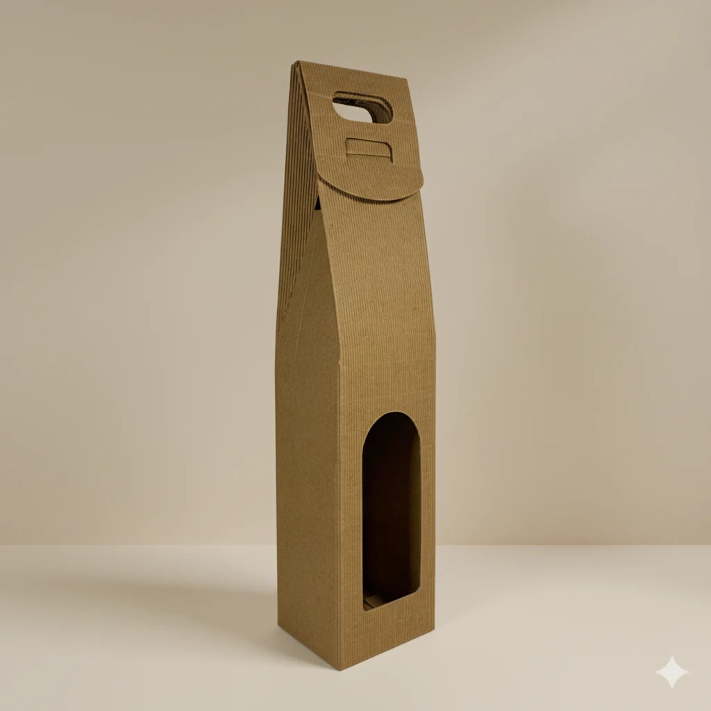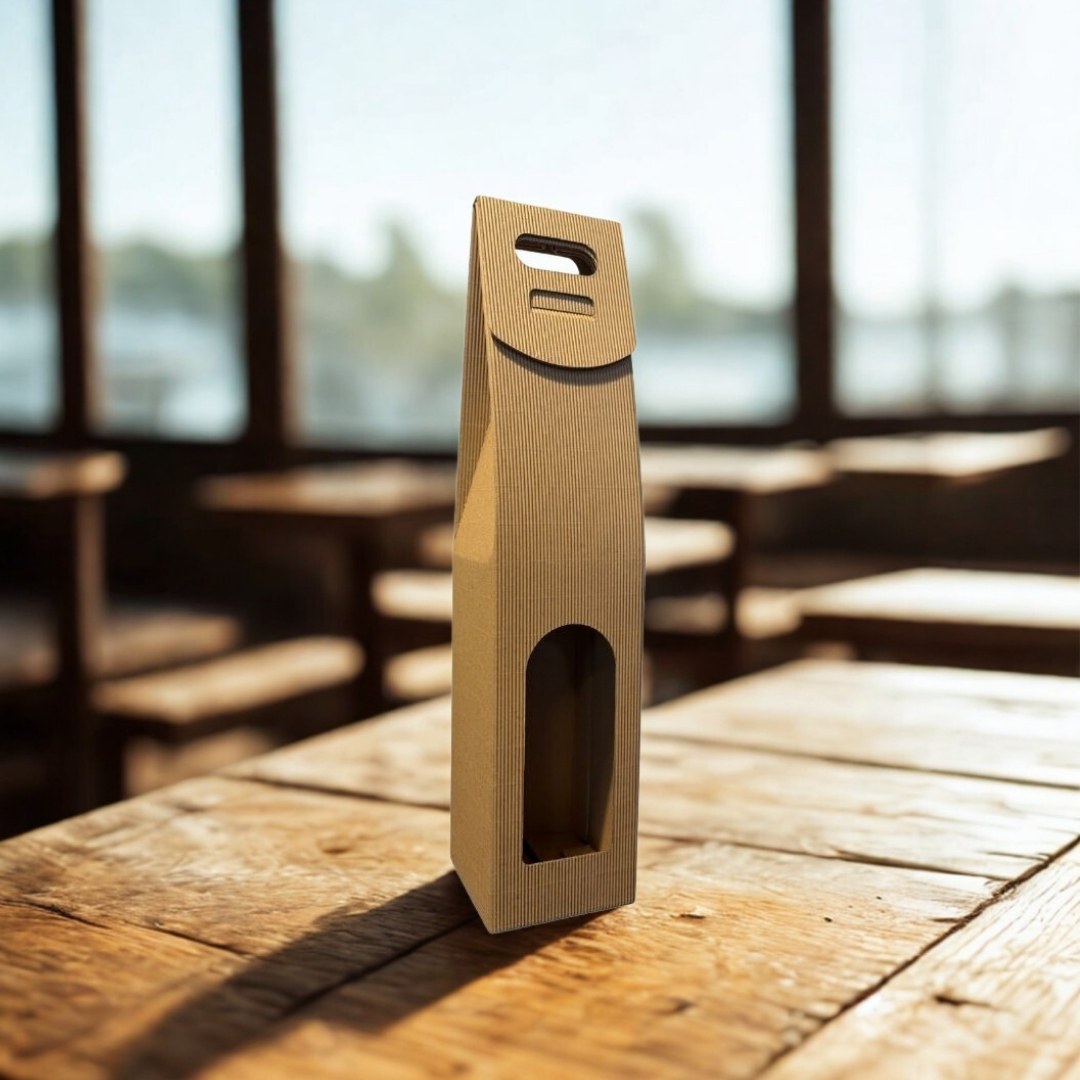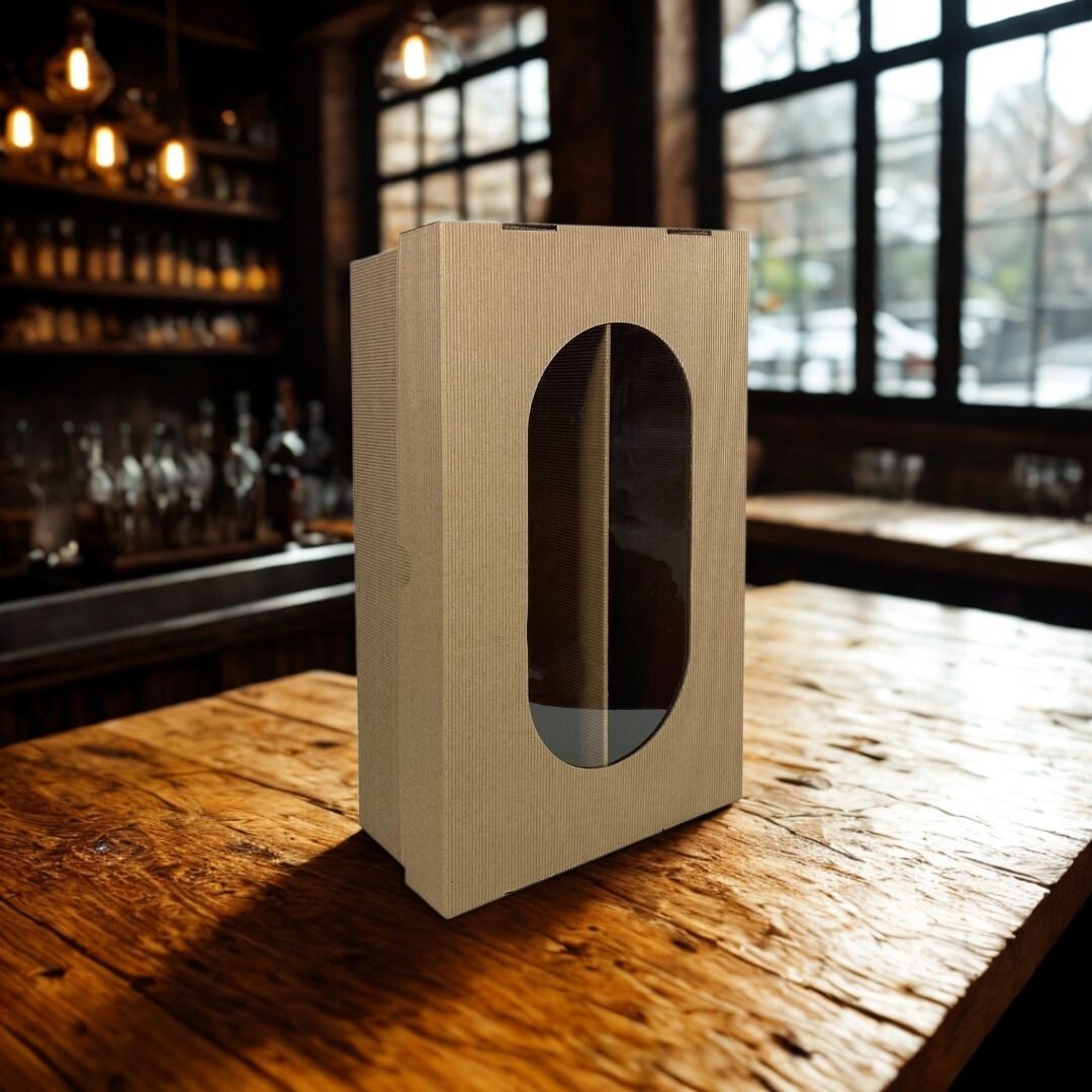 Wykonane z ekologicznej, czterowarstwowej tektury falistej 480 g/m² w naturalnym kolorze. Wytrzymały uchwyt oraz stabilna konstrukcja zapewniają pełne bezpieczeństwo podczas transportu. Przez estetyczne okienko widoczna jest etykieta butelki, co dodaje opakowaniu elegancji i prezentacyjnego charakteru.
