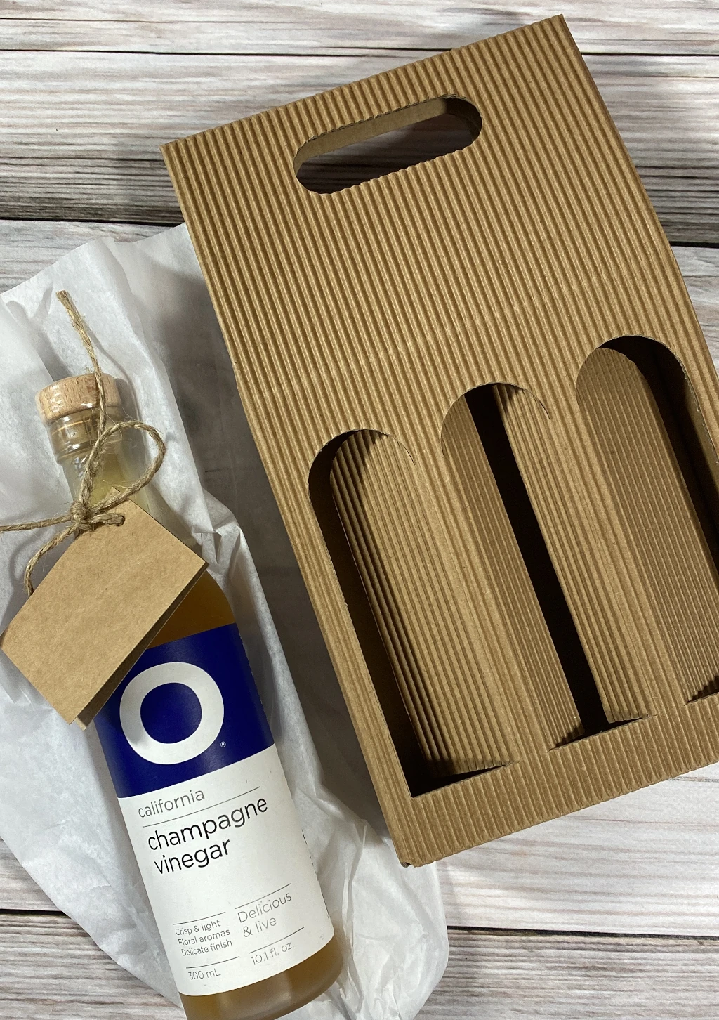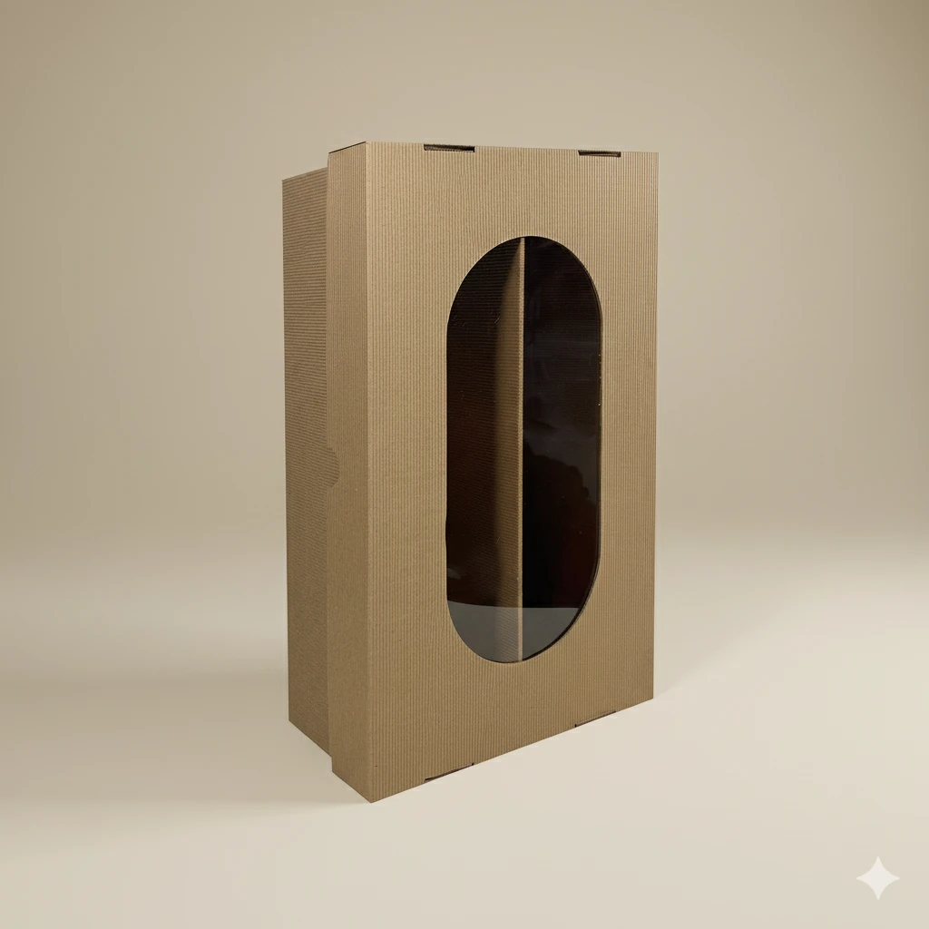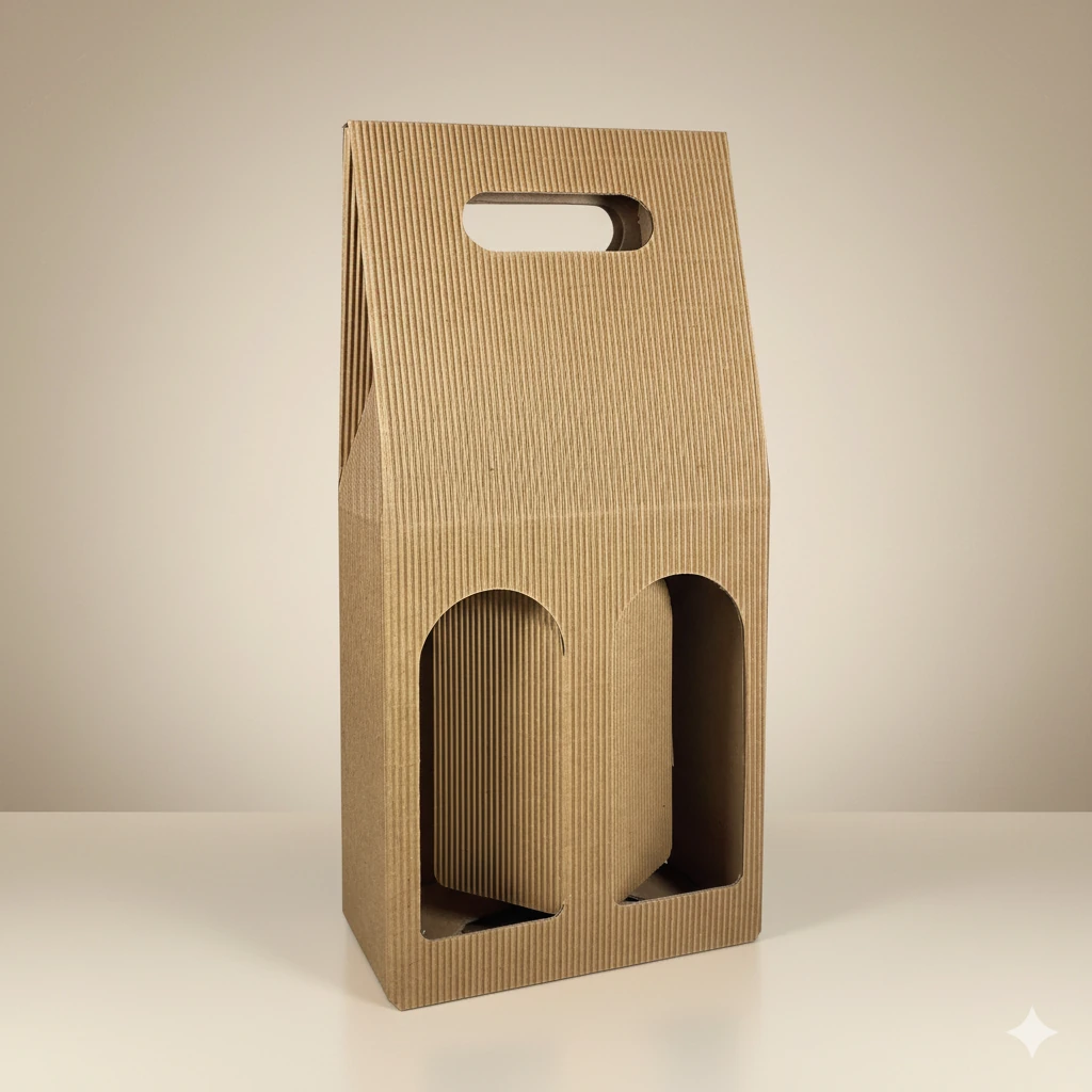 Wykonane z ekologicznej, czterowarstwowej tektury falistej 480 g/m² w naturalnym kolorze. Wytrzymały uchwyt oraz stabilna konstrukcja zapewniają pełne bezpieczeństwo podczas transportu. Przez estetyczne okienko widoczna jest etykieta butelki, co dodaje opakowaniu elegancji i prezentacyjnego charakteru.