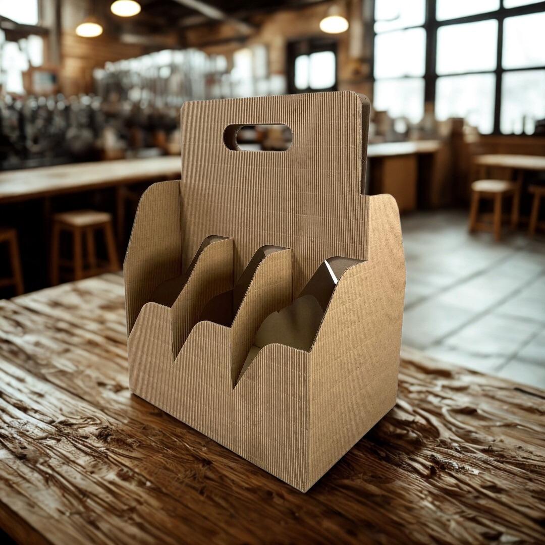 Pudełka przeznaczone do transportu piwa oraz innych napojów w butelkach o pojemności 0,5 l. Wykonane z ekologicznej, czterowarstwowej tektury falistej 480 g/m² w naturalnym kolorze. Wytrzymały uchwyt i stabilna konstrukcja zapewniają bezpieczne przenoszenie i ochronę zawartości.